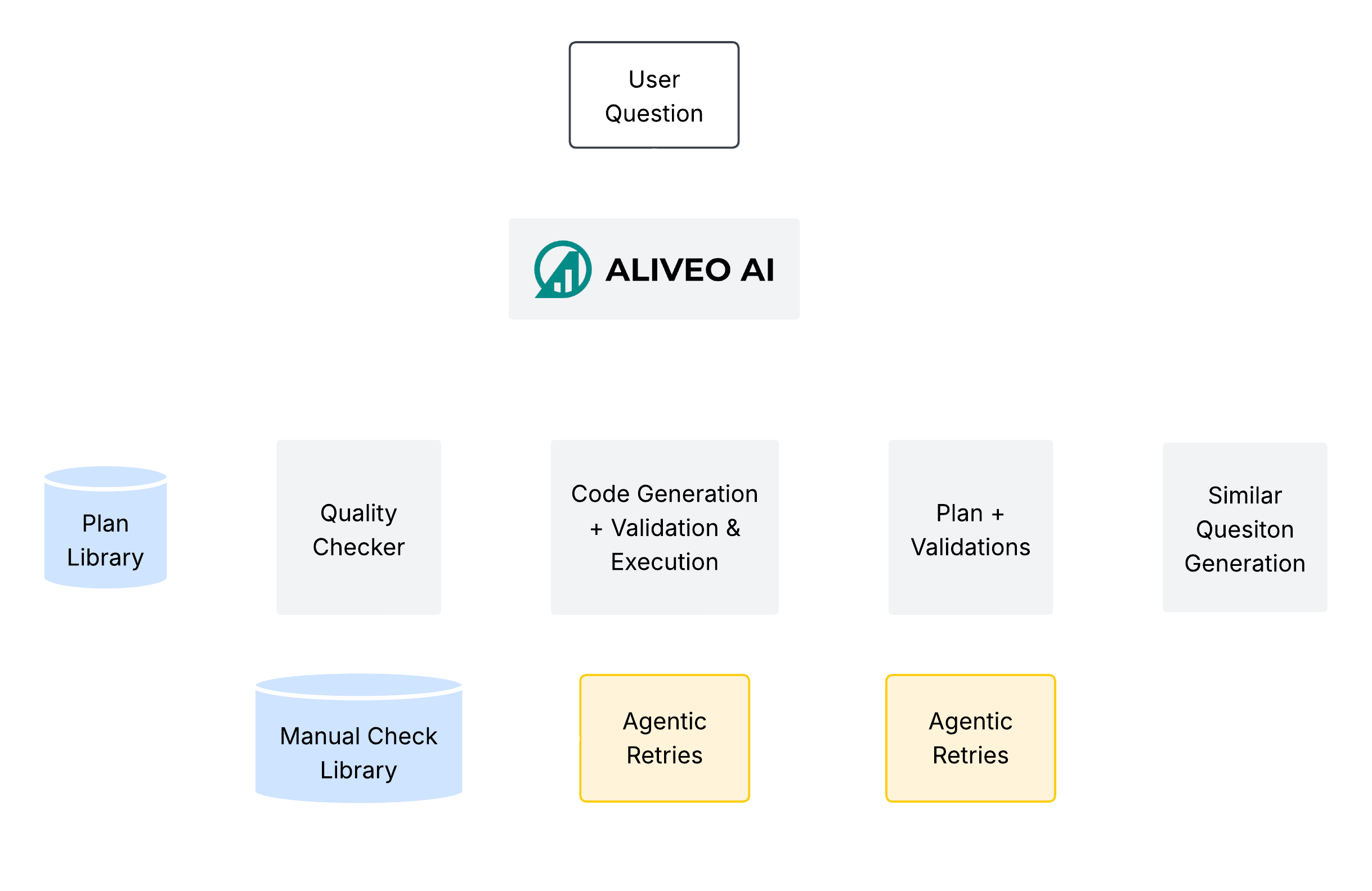 This document describes how Aliveo AI continually refines its planning and execution pipeline based on user interactions. Each time a user submits a question, the system follows a five‐step process to generate, validate, execute, and ultimately store plans for future use. By looping back failed or successful workflows into central libraries, the system learns from every interaction and improves over time.
