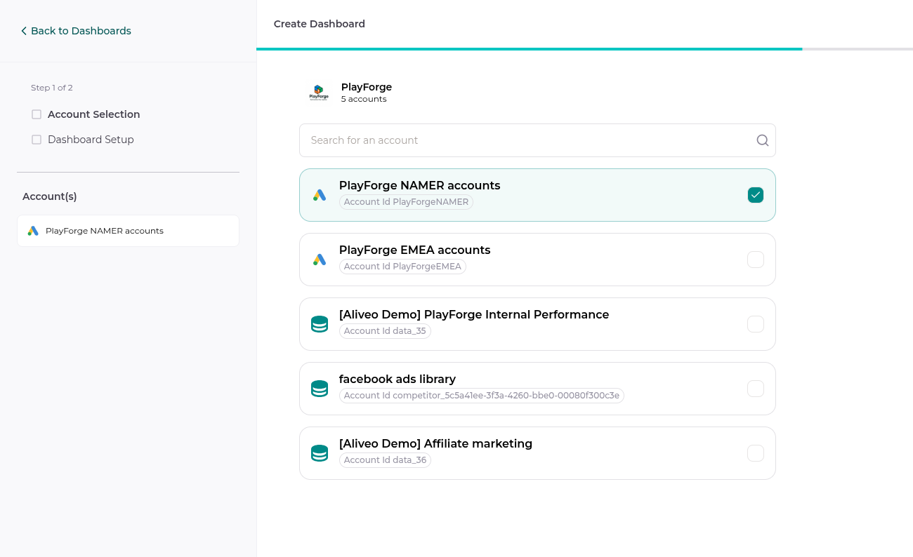 - Select the account(s) your dashboard will analyze. The available data contexts will update based on your selection.