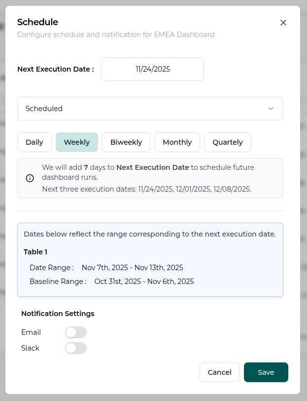 - Choose how often your dashboard should refresh: one-off, daily, weekly, etc.